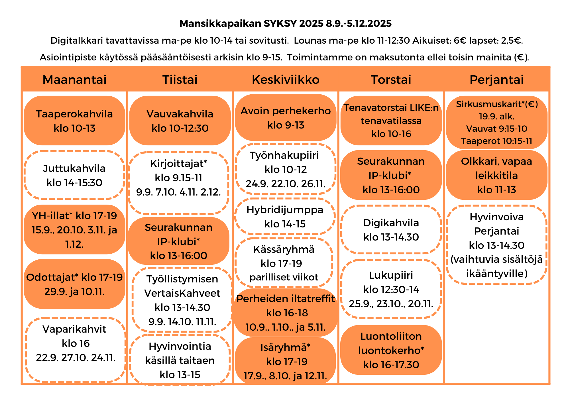 Kerhojen viikoittain vaihtuvat ohjelmatuokiot löydät perjantaisesta viikkopäivityksestä Fb/instasta.